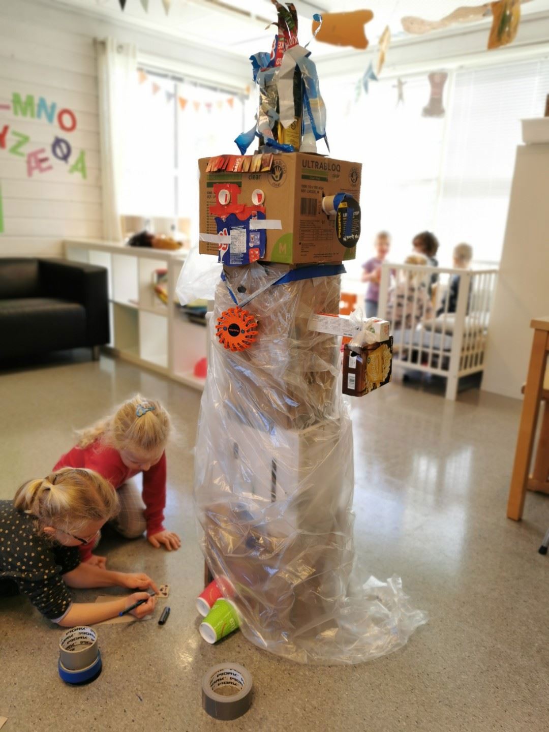 Årets barnehagedag, den 9.mars, ble markert i barnehagen med spennende roboter laget i plast, papir etc. Engasjerte barn og voksne satte pris på en spennende aktivitet, og ikke minst, et flott resultat Tema for årets barnehagedag var: Små steg for kloden