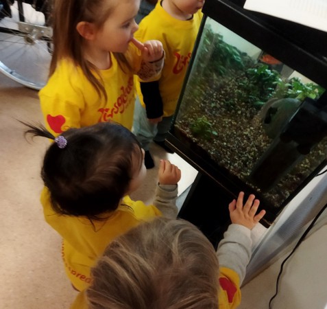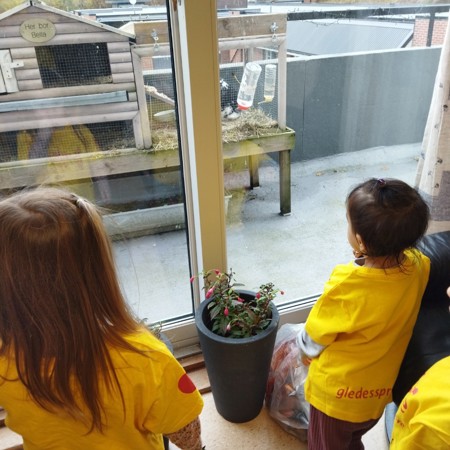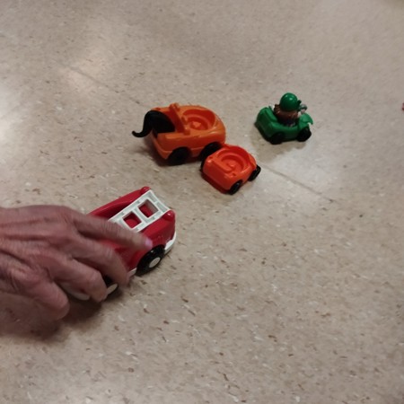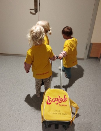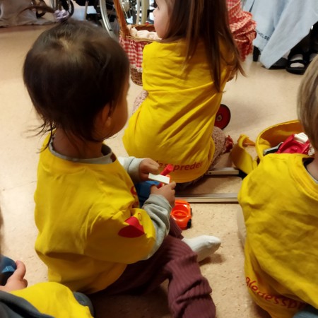 I oktober var vi på to besøk hos 3ABC. Barna er med og pakker den gule kofferten med det de vil leke med, og vise til de eldre. Mens vi er der går barna rundt og lar de eldre få holde, og prøve lekene. Ellers synger og danser vi for dem, eller leker på gulvet foran dem. Noen ganger har de også leker som vi får låne. Det er også stas å få se på fiskene de har og kaninen Bella.