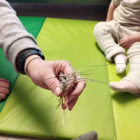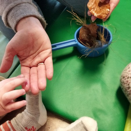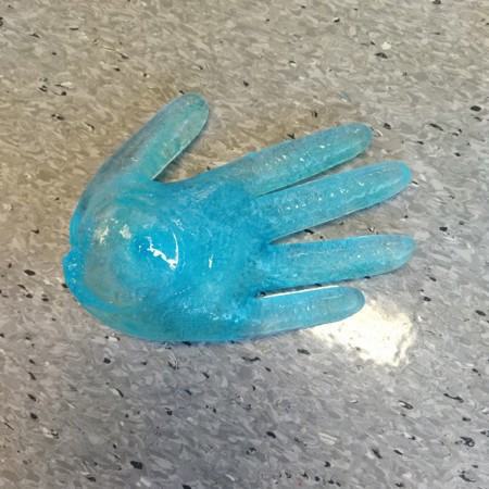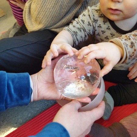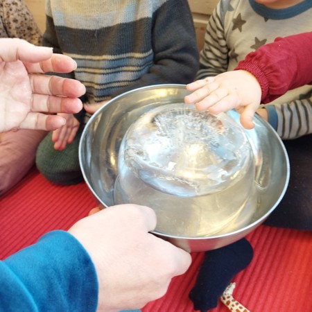 Men da har vi funnet på andre kjekke aktiviteter inne. Vi har blant annet eksperimentert med is og vann. Da tok vi først inn blader og gress som var hvite av frost for å se hva som skjer når de kommer inn i varmen. Deretter fylte vi ulike ballonger med vann. Sammen med barna undret vi oss over hva som ville skje med dem når de stod ute i kulda til neste dag. Spesielt spennende var det å se hva som skjedde med hansken vi hadde fylt med konditorfarge og vann.