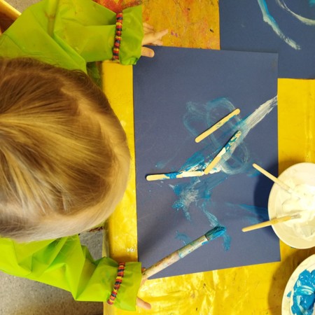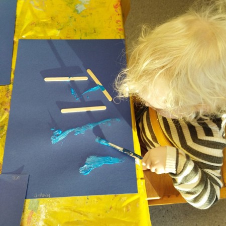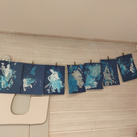 Vi har også malt fine vinterbilder og ispinner som skal bli til snøkrystaller.