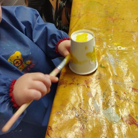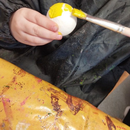 Vi har hatt samling der vi har snakket og sunget om egg, kylling, høne og hane. I dag har vi også hatt første dag med påskeverksted. Det er alltid stor stas når maleduken kommer frem!