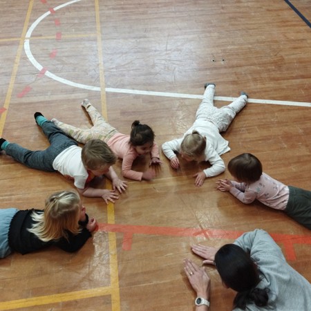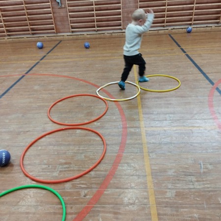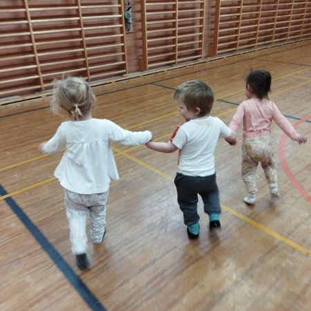 I gymsalen kan vi løpe, hoppe, danse, klatre, sparke ball, leke og mye mer. Vi får låne utstyr, og har stor plass til å boltre oss på...