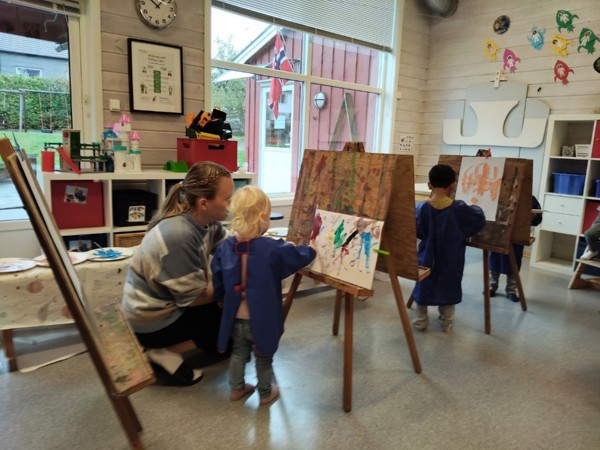 I høstferien hadde vi kunst atilier på marihønene og med sommerfuglene.Det ble spilt rolig musikk og barna fikk ut fantasien sin.Et godt samarbeid mellom avdelingene i høstferien.Rammeplan vektlegger at barn skal få oppleve og skape kunstneriske og kulturelle uttrykk sammen.